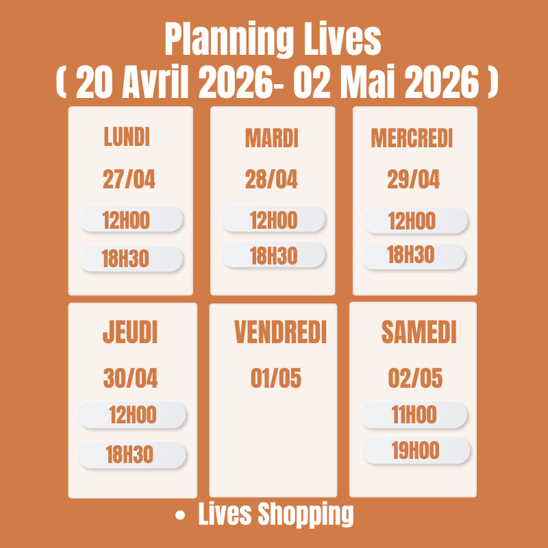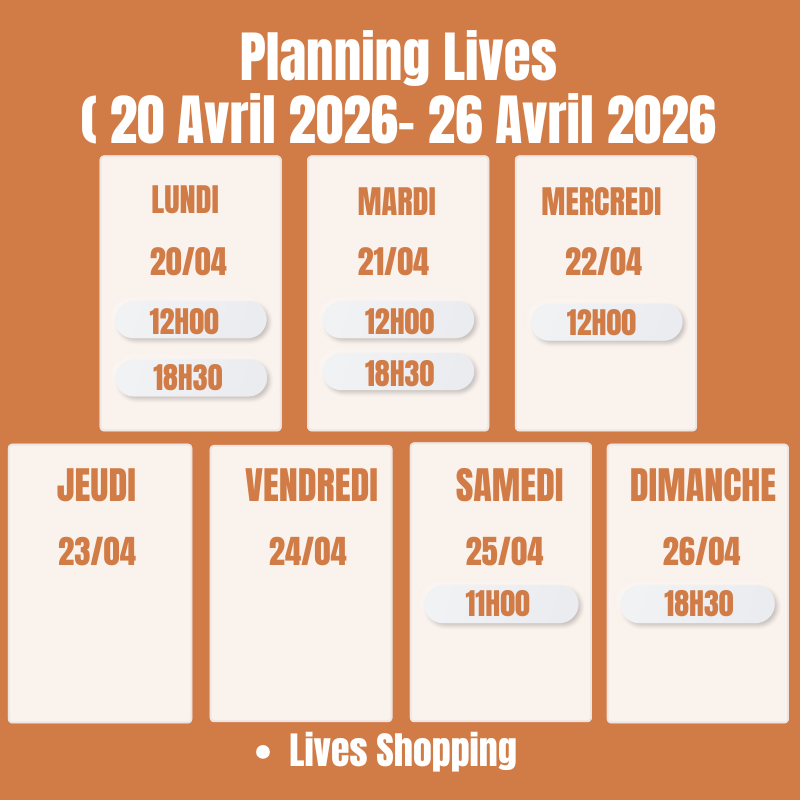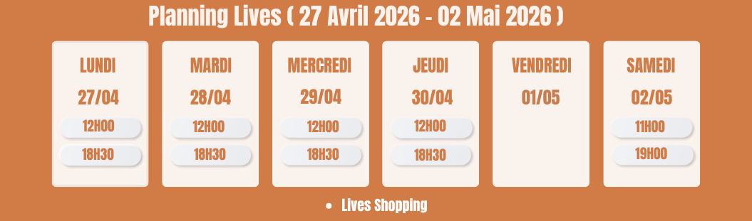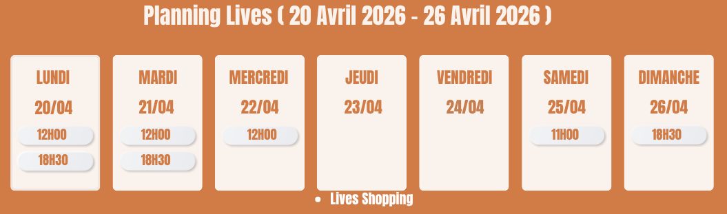 Chez Mona Dress, nous faisons des lives shopping du lundi au samedi. Les horaires des lives sont indiqués sur notre site.
