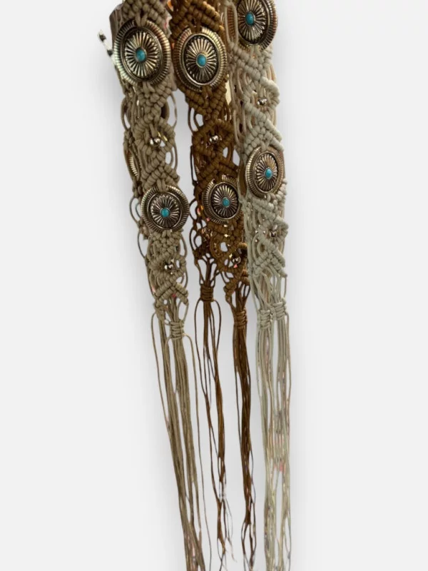 La ceinture Bali est l'accessoire magique de notre collection ! Grâce à son système de liens en coton ciré, elle n'a pas de trous et s'adapte donc à absolument toutes les tailles, du 36 au 48. Elle est ornée d'une magnifique pièce métallique centrale sertie d'une pierre type turquoise, apportant un style ethnique-chic instantané. Vous pouvez la porter en taille haute sur une robe pour marquer la silhouette, ou plus bas sur les hanches avec un jean. Les longs liens terminés par des franges apportent du mouvement et du style à votre tenue. Disponible en beige, écrue ou camel, c'est l'investissement accessoire le plus rentable de la saison !