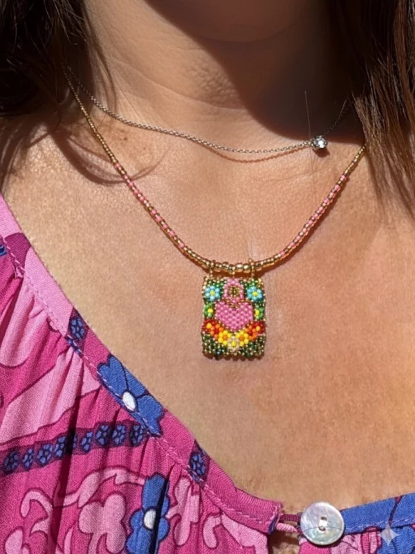 Le collier Ginie Coeur est une création artisanale qui apporte une touche de finesse et de romantisme à votre décolleté. Fabriqué avec de minuscules perles de rocaille tissées avec précision, il présente un motif central en forme de cœur bordé de perles dorées pour un éclat subtil. Grâce à son nœud coulissant en fil de soie, vous pouvez régler la longueur à votre convenance : portez-le ras-du-cou pour un look moderne ou plus long pour accompagner un col en V. Il est disponible en plusieurs coloris tendance : rose tendre, bleu roi intense, turquoise ou noir classique. C'est le petit accessoire qui fait toute la différence, idéal à offrir ou à s'offrir. Il se marie parfaitement avec les robes bohèmes de la collection pour un total look San Coachella.