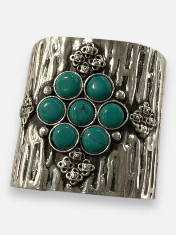 La manchette Madonne est une pièce magistrale qui porte bien son nom ! Plus large que sa cousine Anaé, elle s'impose sur le poignet avec une élégance rare. Son métal doré martelé capture la lumière à merveille, créant des reflets qui illuminent votre bras. On adore son motif floral central orné d'une résine turquoise sublime, évoquant les bijoux baroques italiens. C'est l'accessoire idéal pour structurer une tenue fluide, comme une tunique ou une robe longue. Réglable, elle s'adapte à tous les poignets et reste très confortable malgré sa largeur. Vendue 29 euros, elle offre un look luxueux à prix tout doux. C'est le genre de bijou qu'on garde des années et qui ne se démode jamais. Un vrai coup de cœur de notre collection exclusive pour affirmer votre féminité avec audace et éclat !