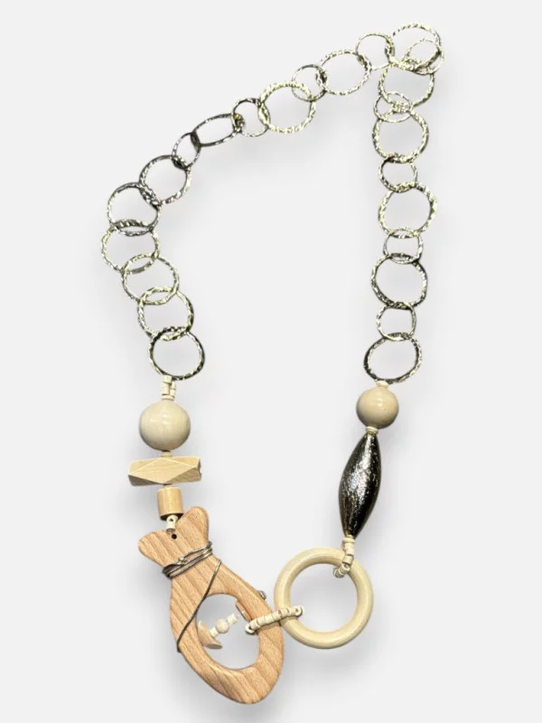 Le collier St Fish est une véritable œuvre d'art à porter autour du cou. Il mélange avec audace des matières naturelles comme le bois et des éléments plus modernes avec des anneaux transparents. C'est un bijou très aérien et volumineux qui reste pourtant incroyablement léger sur la peau. On y retrouve des perles de différentes tailles et un jeu de câbles dorés qui lui donnent un look très créateur. C'est le collier parfait pour habiller un t-shirt uni ou une robe sobre. Pendant le live, on a été bluffé par son allure qui 'en impose' sans alourdir la silhouette. Une pièce originale et pleine de caractère pour 29€.