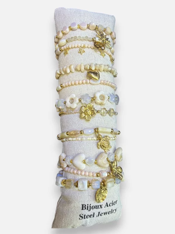 Le lot Vague est l'option la plus douce et naturelle de notre collection de manchettes. Avec ses 12 bracelets dans les tons beiges et écrus, il s'accorde avec absolument tout ! La particularité de ce lot est que les bracelets sont montés sur élastique, ce qui les rend ultra faciles à enfiler au quotidien. On y trouve de jolies perles en cristal qui apportent une brillance subtile et élégante. Pendant le live, Mona l'a présenté comme le compagnon idéal de nos ensembles en lin ou en coton. C'est chic, épuré et très confortable. Un lot complet vendu 90€ avec son support, pour un look 'dandy' revisité et très lumineux.