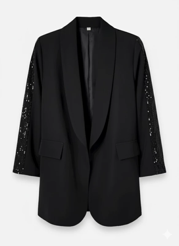 Description : Le blazer noir grande taille, simple et efficace, rehaussé de détails scintillants pour illuminer votre silhouette.