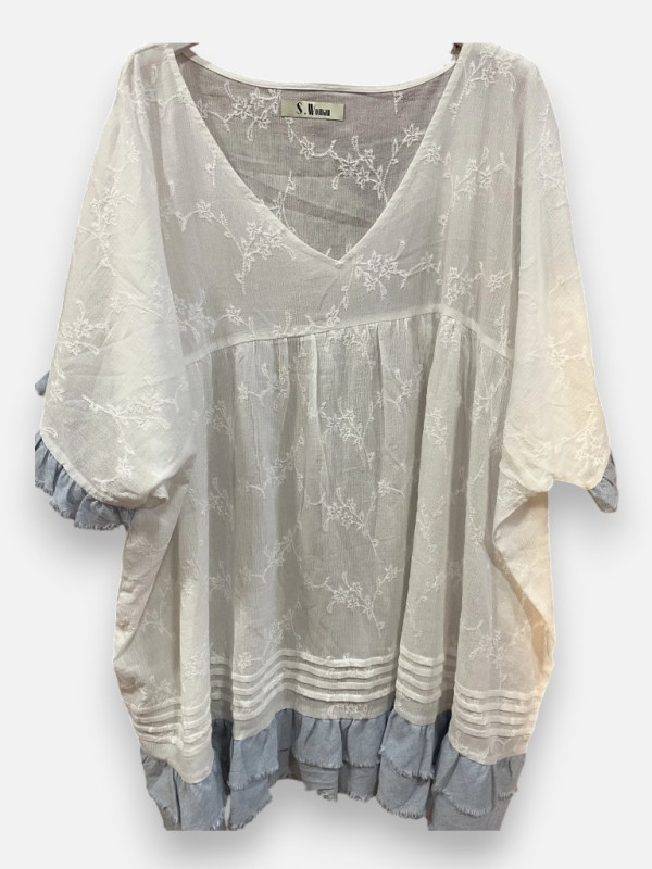La tunique Dalia est une splendeur de la nouvelle collection Mona-Dress qui ravira les amatrices de détails soignés. Son aspect denim clair est sublimé par de délicats motifs brodés ton sur ton qui lui donnent un cachet fou et une allure bohème. Sa coupe est pensée pour le confort des silhouettes généreuses, allant jusqu'au 50, avec une amplitude remarquable au niveau des hanches pour ne rien marquer. Les manches évasées sont ornées de petits volants féminins qui camouflent le haut du bras avec beaucoup d'élégance. Pas de souci de transparence ici, le coton est d'une belle densité tout en restant frais. Portez-la avec le Jean Berry pour un camaïeu de bleus magnifique ou un pantalon blanc pour plus de lumière. C'est la pièce bohème par excellence, à la fois décontractée et très travaillée.