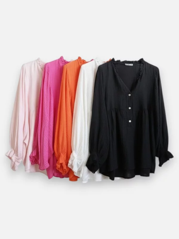 Laissez-vous séduire par la légèreté incomparable de la Chemise Malinou. Fabriquée en 100% gaze de coton, cette matière naturelle et respirante est un pur bonheur à porter, surtout lors des journées ensoleillées. Sa coupe généreuse et fluide convient à toutes les silhouettes, de la taille 40 à la taille 50, masquant les petites imperfections avec élégance. Disponible dans des coloris doux comme le beige, le rose ou le noir classique, elle se marie parfaitement avec un jean ou notre pantalon foulard. Son aspect légèrement gaufré lui donne un look bohème chic irrésistible et présente l'immense avantage de ne pas nécessiter de repassage. Les manches peuvent être portées longues ou retroussées pour une allure plus décontractée. Longue derrière pour couvrir les fesses, elle offre une silhouette élancée et moderne. C’est la chemise « doudou » par excellence que vous ne voudrez plus quitter une fois essayée.