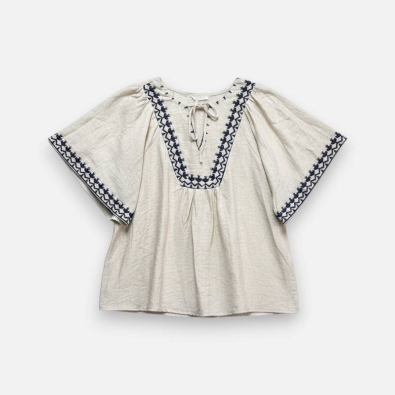 La tunique Martina est l'incarnation même du style bohème chez Mona-Dress. Sa couleur lin naturelle est sublimée par des broderies bleu marine magnifiques sur le décolleté et le long des manches. On craque pour ses manches papillon qui apportent de la légèreté et du mouvement. Sa composition riche en viscose la rend ultra douce et respirante. Elle va du 34 au 42 et peut se porter de différentes façons : rentrée sur le devant d'un jean ou par-dessus un pantalon en gaz de coton. Le petit lien de serrage au décolleté permet de l'ajuster selon vos envies. Une pièce de caractère, intemporelle et très flatteuse.