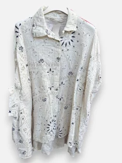 La chemise Olivia est la pépite estivale par excellence. Conçue dans une gaze de coton d'une douceur absolue, elle est incroyablement agréable à porter, même sous 30 degrés. Son imprimé bandana, très tendance, est placé de manière unique sur chaque pièce, rendant votre chemise presque exclusive. Disponible en rose, corail et beige, elle offre une coupe généreuse qui convient aussi bien à un 34 qu'à un 50. Nous avons adoré son tombé fluide et ses manches larges qui n'entravent pas le mouvement. Vous pouvez la porter fermée pour un look bohème chic, ou ouverte sur un débardeur pour une allure plus décontractée. Sa matière naturelle laisse respirer la peau et ne nécessite quasiment aucun repassage, ce qui en fait la compagne idéale pour vos vacances. Un véritable coup de cœur pour son style 'hippie chic' intemporel.