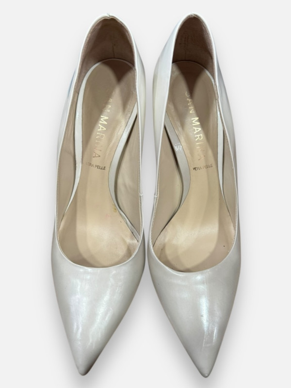 San Marina nous propose ici un stiletto magnifique en cuir couleur ivoire / écru. C'est une pointure 39 à forme pointue qui allonge la jambe. Cette couleur nude est parfaite pour apporter de la lumière à vos tenues et se marie avec tout. Très peu portées, elles sont prêtes pour une nouvelle vie. Un indispensable pour toutes celles qui aiment les talons hauts et élégants.