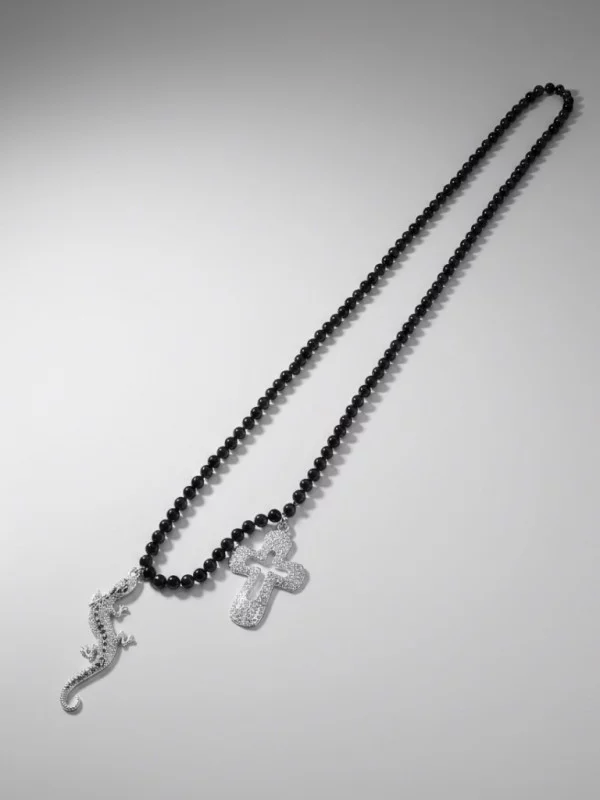 Description : Un sautoir d'inspiration spirituelle orné d'une croix martelée et d'une salamandre porte-bonheur.