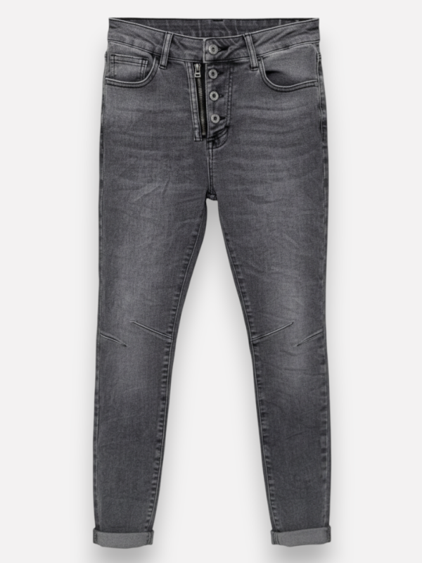 Description : Jeans slim gris délavé, très confortable et avec des poches zippées à l'arrière.