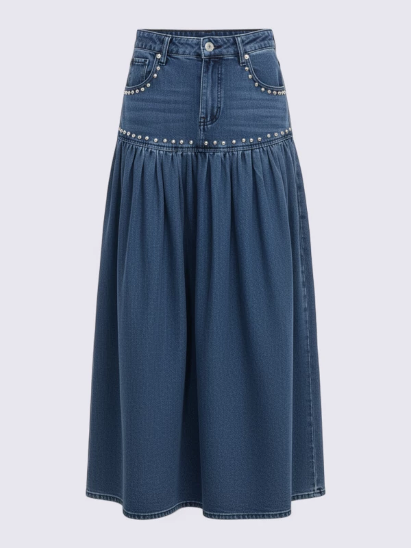 Description : Jupe longue en jean gris à la construction unique, pour une silhouette originale et ultra-tendance.