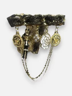 Envie d'un accessoire qui a une âme et une histoire à raconter ? La broche Gentleman est faite pour vous ! Cette pièce d'inspiration très couture, rappelant l'univers de Chanel, est un véritable bijou. Elle se compose d'une chaîne en métal doré entrelacée d'un ruban de tissu irisé, créant un jeu de textures et de lumières absolument superbe. Au centre, un petit personnage stylisé, orné de strass, ajoute une touche d'humour et de préciosité. C'est le détail qui transforme une tenue simple en un look pointu. Comme on l'a suggéré en direct, elle est parfaite pour rehausser le col d'une chemise en jean, le revers d'un blazer, ou même pour personnaliser un pull uni ou une écharpe. Son système d'attache sécurisé vous assure de ne pas la perdre.
