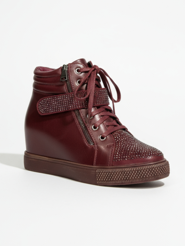 Qui a dit qu'il fallait choisir entre le confort d'une basket et l'élégance d'un talon ? Découvrez la basket Isabelle M, une véritable pépite qui fusionne le meilleur des deux mondes ! Son secret réside dans son talon compensé intérieur, invisible de l'extérieur, qui allonge discrètement votre silhouette et vous offre une démarche assurée, tout en conservant le confort exceptionnel d'une semelle de basket. Son design est à la fois rock et raffiné : un superbe coloris bordeaux profond, facile à associer, rehaussé par des touches de strass scintillants sur la bande velcro et le devant de la chaussure. Cette basket montante épouse parfaitement la cheville pour un rendu très féminin et moderne. C'est la chaussure idéale pour dynamiser un look et affirmer votre style sans jamais sacrifier votre bien-être.