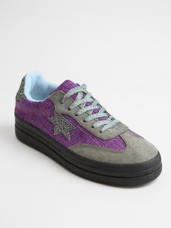 Composition : Mix de matières avec effet daim, tissu chiné rose et détails glitter pour un style unique et féminin.