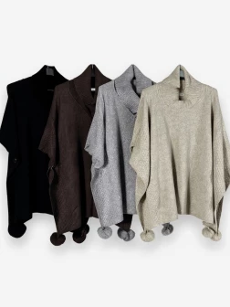 Description : Poncho-pull en maille à pompons, une pièce originale et ultra confortable pour un style bohème chic.