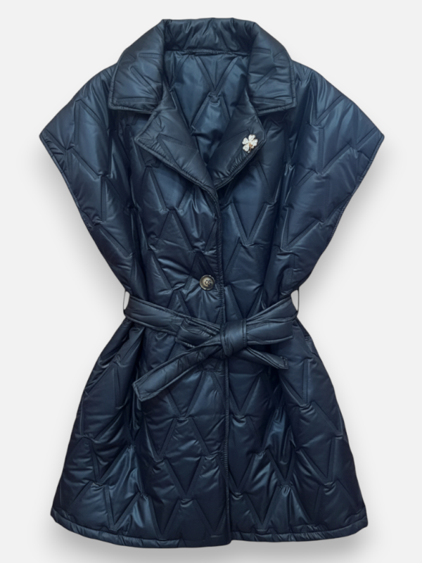 Description : La doudoune sans manches matelassée, chic et pratique, ornée de sa broche porte-bonheur.