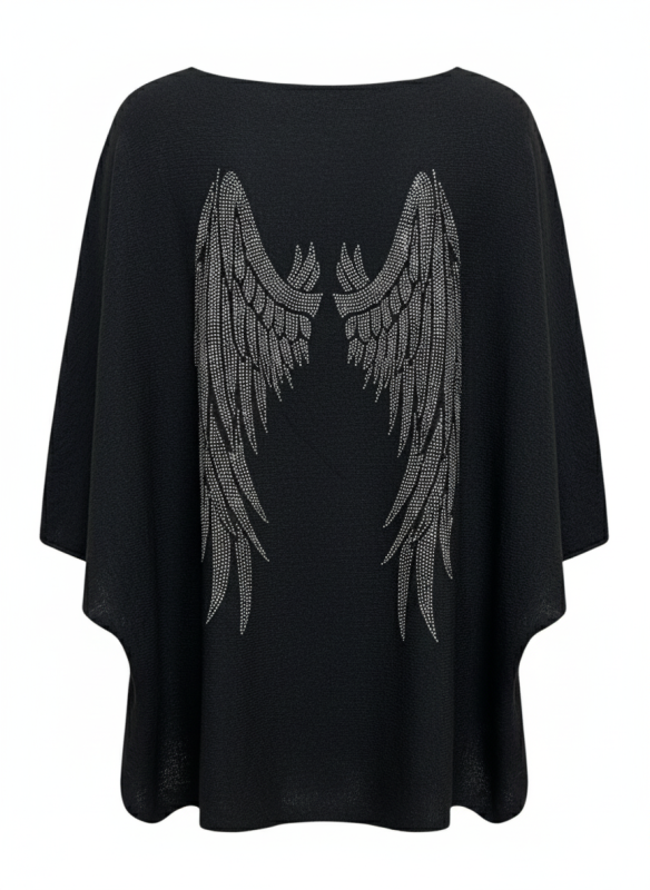 Description : Pull noir col V au dos spectaculaire, orné d'ailes d'ange en strass pour un look simple de face et renversant de dos.