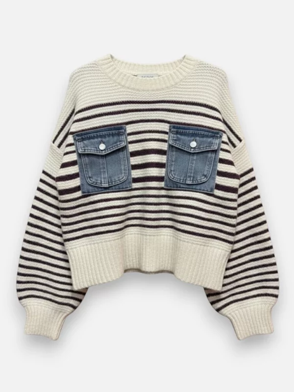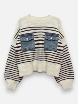 Description : Pull à rayures aubergine et poches en jean, la pièce originale qui mixe les codes avec audace.