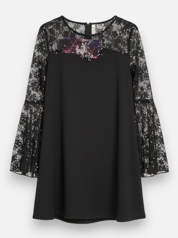 Description : Robe noire fluide et romantique avec ses manches transparentes brodées d'étoiles.