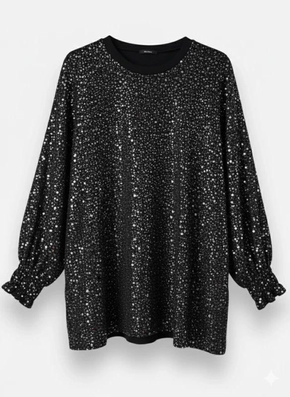 Prête à devenir la reine de la soirée ? Le haut Vanessa est votre meilleur allié pour briller ! Entièrement recouvert de milliers de petits sequins noirs cousus, il capte la lumière comme aucun autre et vous assure une allure spectaculaire. Oubliez les hauts qui grattent : sa base en tissu extensible est incroyablement douce et confortable, vous pouvez le porter à même la peau en toute sérénité. Sa coupe est à la fois chic et facile à porter, avec des manches chauve-souris froncées que vous pouvez remonter pour un effet plus décontracté. Que vous fassiez un 36 ou un 50, il s'adaptera à votre morphologie et vous mettra en valeur. C'est la pièce parfaite pour les fêtes, une soirée entre amis ou simplement quand vous avez envie de mettre des paillettes dans votre vie !