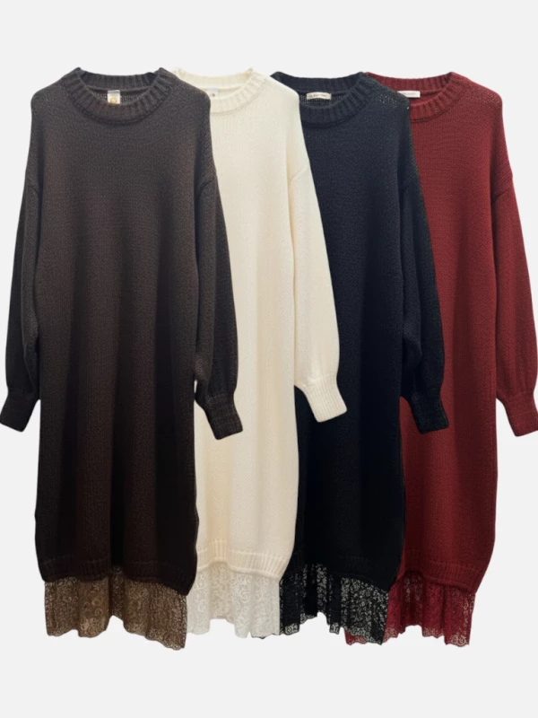 Description : La robe-pull douce et féminine, sublimée par une délicate dentelle pour un look cosy et raffiné.