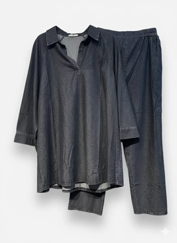 Description : L'ensemble tunique et pantalon en jean léger anthracite, pour une allure chic, moderne et sans effort.