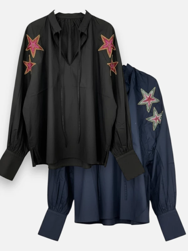 Envie d'une pièce qui a du caractère et qui vous donne une allure de reine ? La tunique Amy est faite pour vous ! C'est bien plus qu'une simple chemise, c'est une véritable déclaration de style. Sa coupe ample et majestueuse, avec ses manches chauve-souris et ses poignets extra-larges, crée une silhouette incroyable, digne d'une super-héroïne moderne. Le détail qui change tout ? Les magnifiques étoiles brodées de perles et de strass sur les poignets, qui ajoutent une touche de magie et de lumière à chaque mouvement. Confectionnée en pur coton, elle est aussi agréable à porter qu'à regarder. C'est la pièce parfaite pour se sentir puissante, élégante et unique.