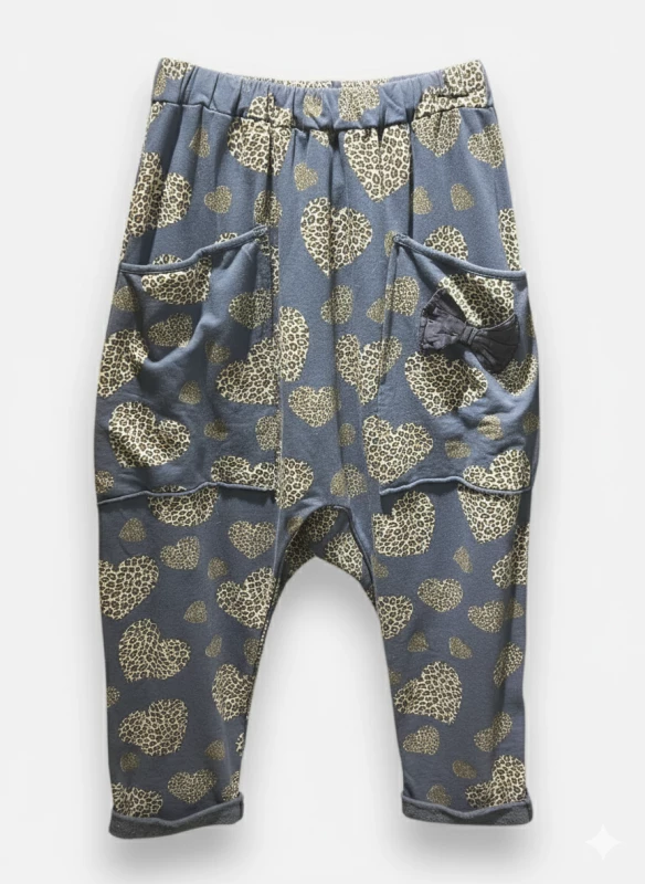 Description : Un sarouel confortable et original, parsemé de cœurs léopard pour un look décontracté plein de fantaisie.