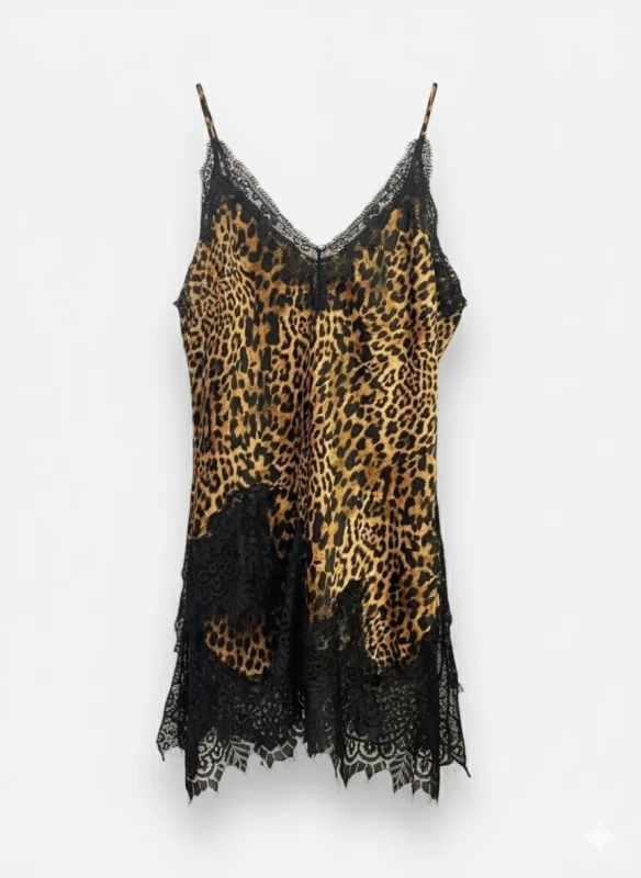 Osez révéler votre côté félin avec une pièce qui sort résolument de l'ordinaire ! Ce top animal est la définition même du sexy-chic, avec son design audacieux et terriblement féminin. Sa coupe asymétrique en diagonale crée un mouvement unique et un look instantanément original qui ne laissera personne indifférent. Le mélange des matières est sublime : la fluidité de l'imprimé léopard rencontre la délicatesse de la dentelle noire, qui souligne magnifiquement le double décolleté en V, à l'avant comme à l'arrière. Conçu pour flatter la silhouette, il convient parfaitement du 36 au 42 et s'adapte même aux poitrines plus généreuses. C'est le haut idéal pour celles qui veulent affirmer leur style avec une pièce forte, sans jamais sacrifier l'élégance.