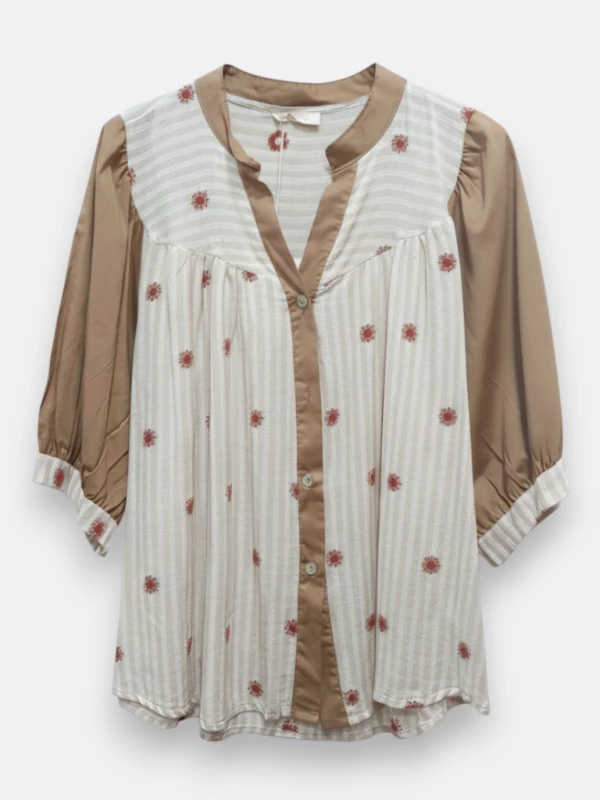Envie d'une pièce qui respire la joie de vivre et l'originalité ? La tunique Soleil est une véritable pépite, une nouveauté qui va illuminer votre garde-robe. Confectionnée dans un coton bi-matière, elle joue sur les textures pour un rendu unique et raffiné. Son charme réside dans ses détails incroyables : de délicats petits soleils brodés en fils bordeaux et camel viennent parsemer le tissu, apportant une touche bohème et poétique. Les manches ballon lui confèrent une allure romantique et tendance, tandis que les boutons, de forme carrée et nacrée, signent son originalité. C'est bien plus qu'une simple chemise, c'est une pièce de créateur que vous pourrez porter en toute saison, sous un gilet en hiver ou seule dès les premiers beaux jours.