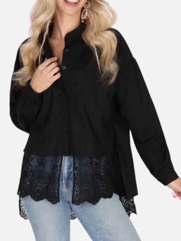 Description : Chemise Kim noire fluide, l'élégance intemporelle sublimée par de délicats détails en dentelle.