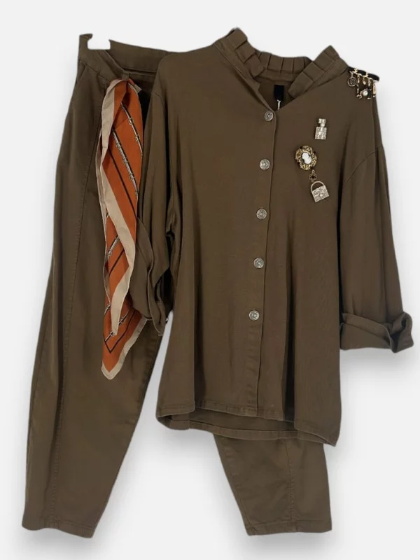 Vous aimez les tenues qui ont une histoire à raconter ? L'ensemble Margo est une pièce de caractère qui ne laissera personne indifférent. Inspiré de l'uniforme d'officier, il est revisité dans un esprit couture et féminin. Confectionné dans un superbe coton kaki avec une pointe de lycra pour le confort, cet ensemble se compose d'une chemise à la coupe impeccable et d'un pantalon ajusté. Le col officier, boutonné jusqu'en haut, confère une allure stricte et élégante, immédiatement adoucie par les accessoires fournis : un magnifique foulard en soie et une collection de broches que vous pourrez disposer au gré de vos envies. Le pantalon, taille haute et doté de poches, emboîte parfaitement les formes pour une silhouette flatteuse. C'est une tenue complète, audacieuse et sophistiquée, pour les femmes qui osent un style affirmé.