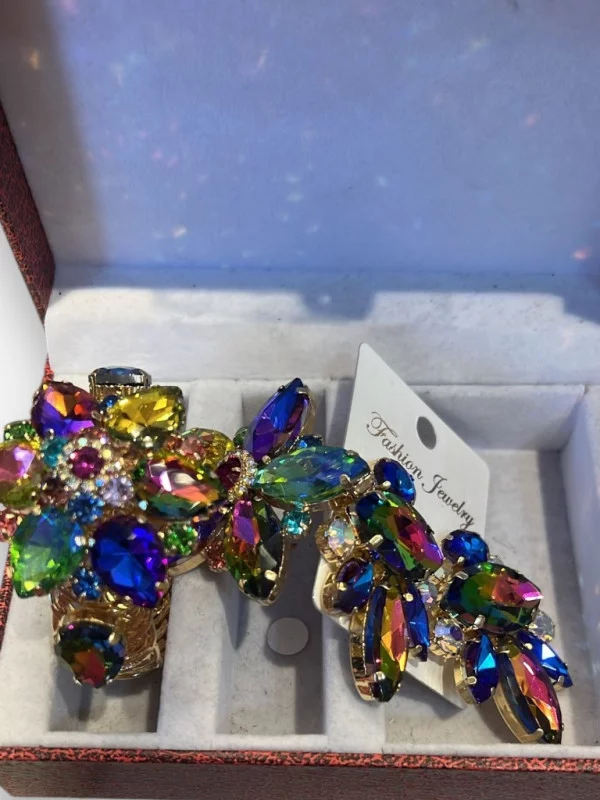 Composition : Métal, résine et strass, pour une parure complète et originale.