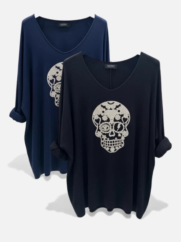 Description : Le petit pull rock et léger, avec sa tête de mort pailletée pour une touche de glamour rebelle.