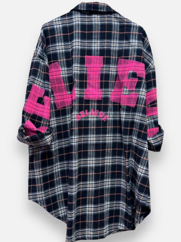 Prête à affronter le froid avec style et une touche d'optimisme ? La chemise Believe est bien plus qu'une simple chemise à carreaux, c'est une pièce forte qui allie confort et personnalité. Inspirée du style "petite maison dans la prairie" avec une touche résolument moderne, elle est confectionnée dans un tissu épais au toucher flanelle d'une douceur incroyable. Ce qui la rend si spéciale, c'est son inscription "Believe" qui se déploie dans le dos, un message positif qui contraste avec son allure décontractée. Portez-la fermée comme une chemise classique, ou ouverte comme une surchemise sur un haut plus fin pour un jeu de superpositions très tendance. Sa coupe longue et sa matière chaude en font l'alliée parfaite des journées fraîches, pour un look à la fois confortable et stylé.