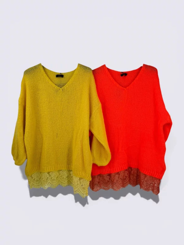 Vous rêvez d'un look sophistiqué sans avoir à superposer les couches ? Le pull Eve est la solution ingénieuse et stylée que vous attendiez. Il combine la chaleur d'une maille douce et confortable avec l'élégance d'un caraco en dentelle, le tout en une seule pièce ! Fini le casse-tête du matin pour trouver le top parfait à glisser sous votre pull : sa base est ornée d'une magnifique bande de dentelle directement cousue, garantissant un tombé impeccable tout au long de la journée. Ses couleurs vitaminées, jaune ou orange, sont idéales pour illuminer le teint et apporter une touche de gaieté à vos tenues. C'est le pull qui vous simplifie la vie tout en vous assurant une allure soignée et résolument féminine.