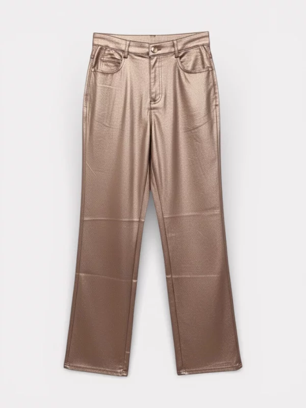 Les filles, préparez-vous à briller avec le jean Joe ! Ce n'est pas un jean classique, mais un pantalon en tissu enduit avec un fini nacré métallisé absolument divin. Sa coupe est droite, légèrement évasée vers le bas pour élancer la jambe. Mais son vrai secret, c'est son confort : avec 5% de lycra, il s'adapte à vos formes sans jamais vous serrer. Disponible en rose nacré ou en bronze, il apporte une touche de lumière incroyable à vos tenues d'hiver. Mona le trouve fabuleux avec une chemise en dentelle pour un contraste de matières réussi. Il va du S (36) au XL (42). C'est le pantalon parfait pour celles qui veulent sortir de l'ordinaire et assumer un style pétillant et moderne.