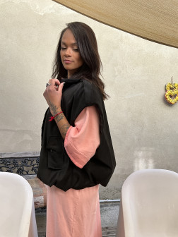 Le Perfecto Jax est l'une de nos nouveautés les plus audacieuses. Sa matière en suédine est d'une douceur remarquable et offre un tombé impeccable. Sa particularité réside dans sa coupe sans manche et son fini 'boule' au bas grâce à un élastique discret, ce qui structure magnifiquement la silhouette. Ce gilet façon perfecto peut se porter fermé pour un effet cintré et architecturé, ou ouvert pour un style plus décontracté. Il est idéal pour la superposition : portez-le par-dessus un gros pull, une robe sweat comme la Nixie, ou même un autre perfecto en cuir pour un mélange de matières ultra-pointu. Les poches à pressions sont fonctionnelles et ajoutent une touche pratique. C'est la pièce parfaite pour la mi-saison qui va du 34 au 46, voire 48 ouvert.