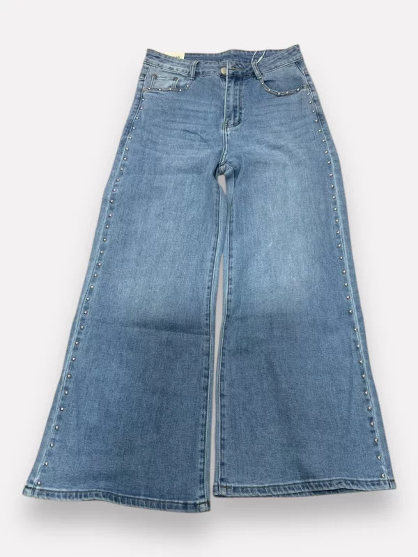Un jean 5 poches tendance avec rivets argentés et coupe 7/8ème évasée.