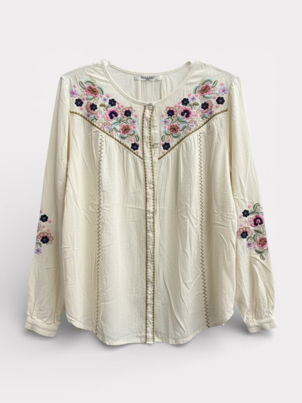 La Tunique Lysandre est une ode à la féminité et à l'artisanat. Confectionnée dans un coton 100% pur et respirant, elle arbore de somptueuses broderies florales colorées sur le devant et sur ses magnifiques manches ballon. Sa couleur ivoire apporte une douceur naturelle qui met en valeur les motifs roses, verts et bleus. Sa coupe ample et vaporeuse en fait une pièce ultra agréable à porter, même lors des journées les plus chaudes. Elle se boutonne sur toute la longueur, permettant de la porter fermée ou légèrement ouverte sur un top. Un véritable coup de cœur pour un look bohème authentique et raffiné.