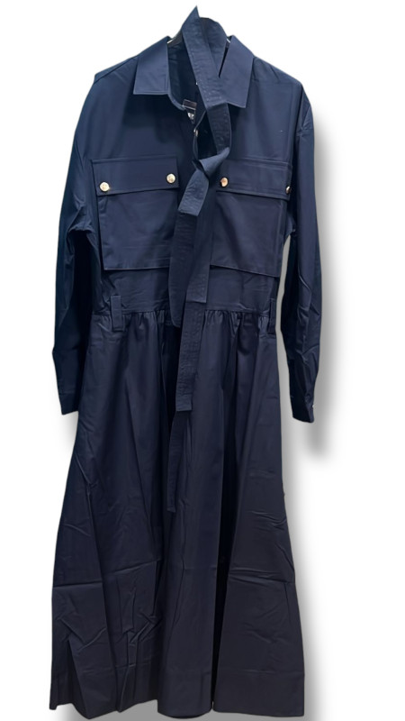 La robe saharienne Aline est une véritable pièce maîtresse de notre collection, qualifiée de produit 'couture' par notre experte. Sa confection en popeline de coton 100% lui confère une tenue impeccable et un tombé majestueux. Déclinée dans un bleu marine profond et chic, elle s'inspire du vestiaire saharien avec ses poches poitrine à soufflet et sa boutonnière intégrale ornée de boutons dorés brillants qui apportent une touche de lumière sophistiquée. Sa coupe cintrée, soulignée par une ceinture à passants, structure magnifiquement la silhouette tout en offrant une grande ampleur de tissu sur le bas pour un mouvement fluide. Très versatile, elle est la candidate idéale pour une cérémonie ou un mariage civil, tout en restant facilement reportable au quotidien avec une paire de baskets dorées et une veste en jean. Une robe d'une qualité rare, destinée aux femmes en quête d'élégance absolue.