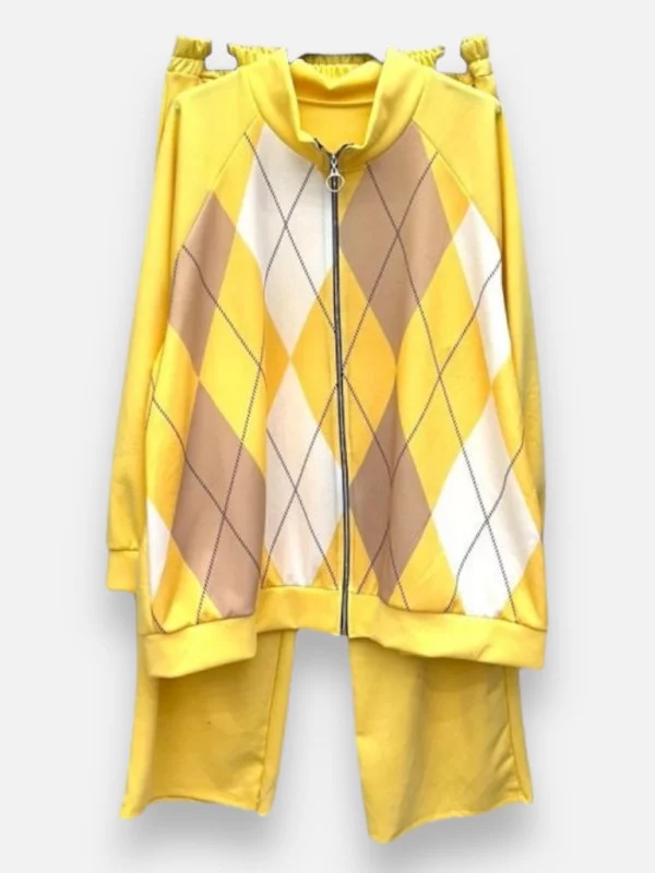 L'Ensemble Ugo est une véritable pépite pour les amoureuses du style 'Berlingot' et vintage. Cet ensemble jogging revisité se compose d'une veste zippée et d'un pantalon fluide, offrant une allure chic et dynamique. On craque pour ses motifs en losanges texturés qui rappellent les codes iconiques des années 80. C'est le genre de tenue que vous pouvez porter aussi bien pour aller travailler que pour vos moments de détente, tout en restant parfaitement élégante. Le bas monte jusqu'à un bon 50 grâce à sa taille élastique ultra-confortable, tandis que le haut convient parfaitement jusqu'à la taille 48. Disponible en rose, jaune, vert ou noir, cet ensemble ne se repasse pas et garde des couleurs éclatantes lavage après lavage. Un indispensable pour toutes celles qui cherchent le style sans l'effort !