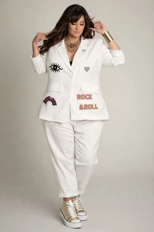Le Tailleur Rock & Roll est la pièce maîtresse pour celles qui veulent s'affirmer ! Cet ensemble deux pièces à 89€ propose un blazer loose oversize et un pantalon coupe chino avec deux pinces élégantes. On adore ses détails travaillés : un patch oeil mystérieux, l'inscription Rock & Roll brodée, et mon fameux éclair flash fétiche. Ce tailleur est l'aventure incarnée, surtout en blanc pour un look hivernal audacieux, mais il reste une valeur sûre en noir ou en rose. Portez-le avec une paire de Converse ou des baskets montantes pour casser le côté formel. La veste est généreuse et monte jusqu'au 48, tandis que le pantalon, monté sur élastique avec ceinture incluse, s'adapte parfaitement jusqu'au 46. Un ensemble banger qui ne passera pas inaperçu !