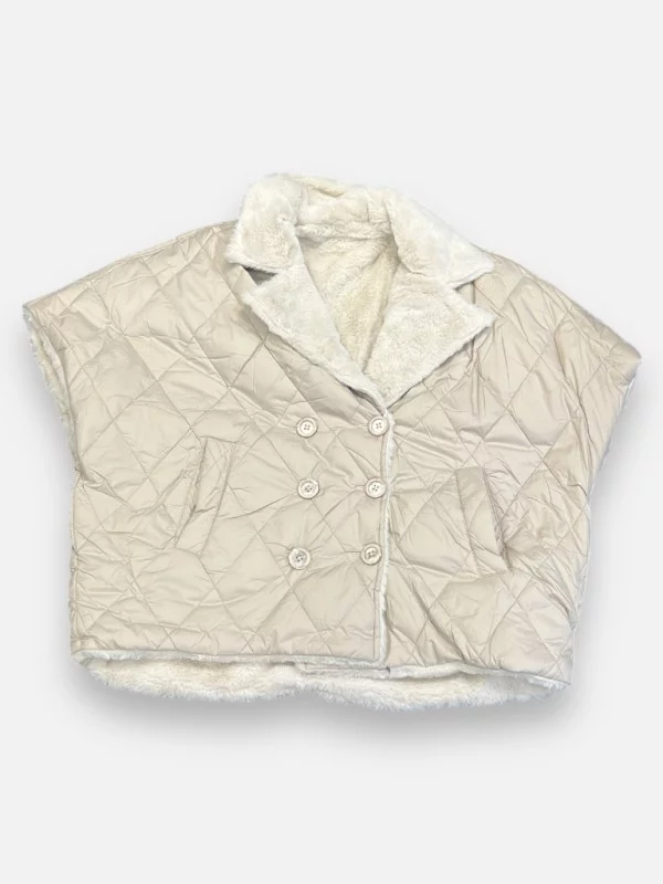 C'est la pièce coup de cœur du live : le gilet Erica est entièrement réversible ! D'un côté, une face matelassée beige nacrée pour un look chic et protecteur ; de l'autre, une face en fausse fourrure mouton ultra-douce pour un effet doudou irrésistible. Ce gilet sans manches est l'allié parfait des superpositions : portez-le sur un gros pull ou sous un manteau pour plus de chaleur. Il dispose d'un double boutonnage élégant et d'une coupe généreuse qui convient jusqu'à la taille 46. On adore sa polyvalence qui permet de passer d'un style urbain à un style cocooning en un clin d'œil. C'est une pièce unique dans notre collection, alors si vous cherchez à combiner confort thermique et allure tendance, ce gilet est fait pour vous !