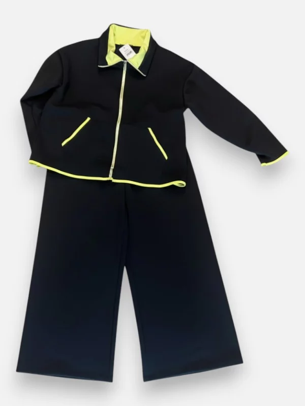 L'ensemble Nuance est la définition même du confort stylé chez Mona-Dress. Composé d'une veste zippée et d'un pantalon fluide en néoprène, cet ensemble offre un toucher soyeux et un tombé impeccable. Le vrai plus, c'est ce liseré jaune fluo qui vient souligner les fermetures éclair, le col et les poches, apportant un peps incroyable à la silhouette. Que vous choisissiez le noir classique, le marine profond ou le taupe élégant, cet ensemble vous garantit une allure 'sportwear chic' sans aucun effort. Le pantalon est d'une aisance totale et la veste peut se porter fermée ou ouverte sur un petit top. C'est une tenue qui ne se repasse pas, parfaite pour les femmes actives qui veulent rester impeccables du matin au soir. Convient parfaitement du 36 au 46.