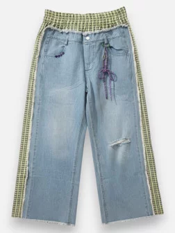 Le Jean Fun porte bien son nom ! À 89 euros, ce jean est une véritable pièce de créateur qui ne passera pas inaperçue. Sa particularité réside dans ses bandes latérales à carreaux ou rayées (selon le modèle) dans les tons vert amande et rose fuchsia, agrémentées de détails effilochés pour un côté rock assumé. Sa coupe est ample et généreuse, convenant parfaitement du 36 au 42. On adore sa ceinture élastique qui assure un confort total et ses petits accessoires 'gris-gris' amovibles avec mousqueton qui ajoutent une touche ludique. Légèrement destroy avec des zones d'usure stylisées, il reste pourtant facile à porter au quotidien. Lors du live, nous l'avons présenté comme le jean idéal pour celles qui aiment sortir des sentiers battus. Que vous mesuriez 1m55 ou 1m80, sa longueur s'adapte grâce à ses revers possibles. C'est le jean 'signature' pour un look détonnant et ultra-stylé !