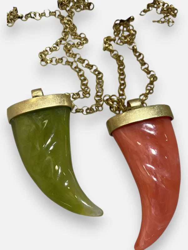 Le collier Corne Sacrée est une pièce forte qui attire immédiatement tous les regards. Inspiré du style 'dent de requin', son pendentif présente un magnifique aspect nacré et lustré qui capte la lumière à chaque mouvement. Monté sur un cordon orné de perles délicates, il se décline en deux coloris parfaits pour la saison : un saumon orangé chaleureux et un vert d'eau rafraîchissant. C'est l'accessoire typique qui transforme un haut tout simple en une tenue de caractère. Conseil style : il est divin porté sur un décolleté en V, comme avec notre pull Tagada ou nos tuniques en coton. Son côté ethnique chic se marie à merveille avec des matières naturelles comme le lin ou le denim. À 29 euros, c'est un investissement mode malin pour apporter une touche solaire et mystique à vos tenues printanières et estivales. Une pièce originale qui ne laissera personne indifférent.