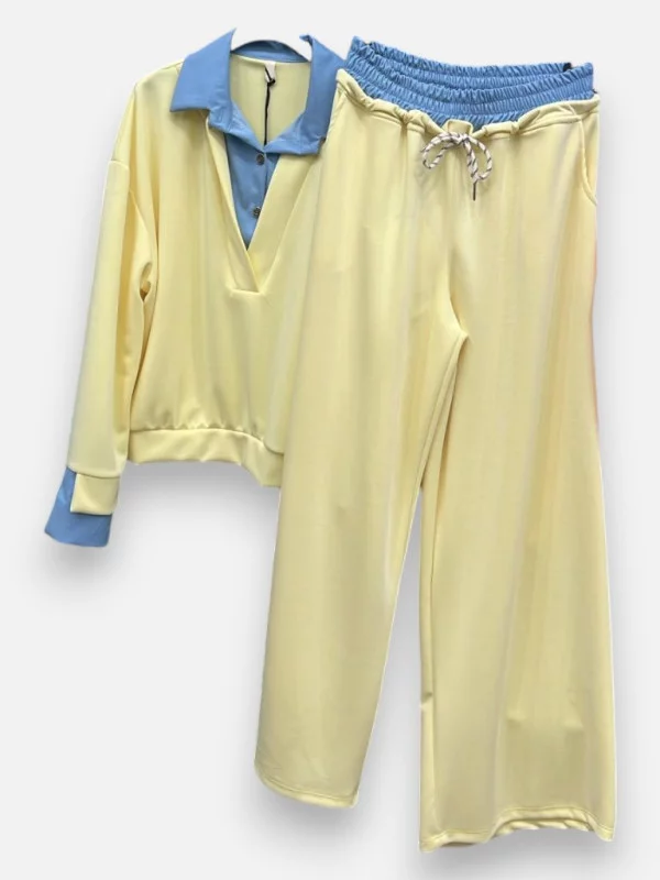 L'Ensemble Lola est un chef-d'œuvre de fluidité et de confort. Il se compose d'un haut bi-matière donnant l'illusion parfaite d'un pull col V porté sur une chemise, et d'un pantalon large assorti. La matière en viscose offre une légèreté incroyable tout en gardant une excellente tenue. Le pantalon dispose d'un vrai lien de serrage à la taille pour un ajustement sur-mesure. En live, cet ensemble a fait fureur en jaune et en rose, avec ses rappels de bleu ciel sur les manches et le bas. C'est la tenue 'pyjama de ville' ultra chic qui vous permet de rester élégante du matin au soir sans aucun effort de stylisme.
