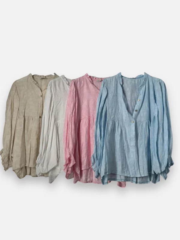 La tunique Emori est la réponse à toutes vos prières mode : elle est stylée, confortable et surtout, elle ne nécessite aucun repassage ! Sa matière crêpée unique offre un tombé impeccable qui ne se froisse jamais. On craque pour sa coupe chauve-souris ultra-moderne et ses manches 7/8ème qui dégagent joliment le poignet pour mettre en valeur vos bijoux. Son décolleté boutonné et sa coupe plus longue à l'arrière en font une pièce flatteuse pour toutes les silhouettes, du 36 au 46. Disponible en blanc, beige, rose tendre et bleu ciel, elle s'adapte à toutes vos envies de printemps. Conseil style : portez-la avec un jean boule pour un look décontracté ou rentrez-la légèrement sur le devant dans un slim pour une allure plus structurée. C'est la pièce versatile par excellence qui vous accompagnera du bureau aux sorties entre copines avec une aisance absolue.