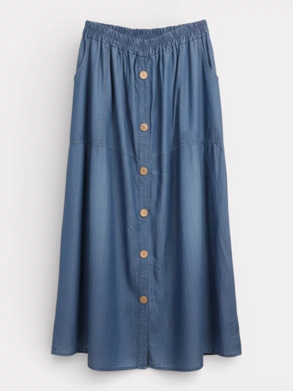 La jupe Manon est l'alliée parfaite de votre confort quotidien. Réalisée dans un Tencel d'une douceur exceptionnelle, elle offre une fluidité de mouvement incomparable. On adore son design astucieux : un faux boutonnage décoratif qui structure la silhouette sans risque d'ouverture impromptue, et deux grandes poches latérales agrémentées de plis élégants qui créent un volume flatteur. La taille est dotée d'un élastique fin spécialement conçu pour ne pas rouloter, assurant un maintien impeccable du 40 au 50. Sa longueur généreuse est un atout majeur, convenant parfaitement aux femmes mesurant jusqu'à 1m80. Que vous la portiez haute pour marquer la taille ou plus bas sur les hanches, elle s'adapte à vos envies. Associez-la à un petit haut rentré pour un look féminin et décontracté-chic qui fera fureur cette saison.